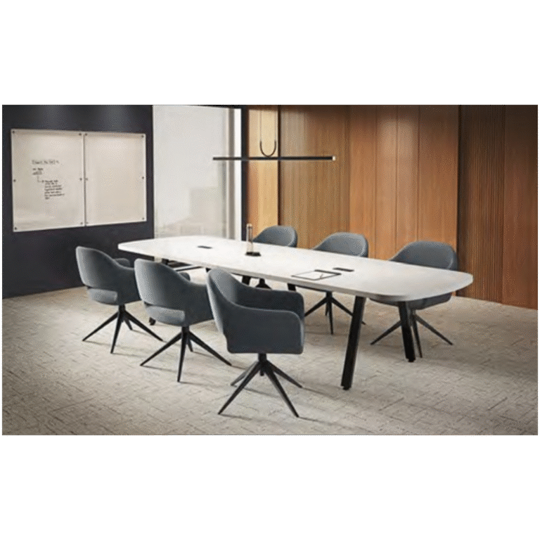 The Arena Conference Table with Metal VA Legs delivers a sleek, modern look with durable steel support and a clean laminate top built for everyday performance. Featuring a bold 1.5” thick top and a 48” width, its gently tapered shape with softly rounded corners improves sightlines along longer tables while maintaining comfortable seating. Wider ends allow room to accommodate an extra guest when needed. Offered in a range of sizes and finish options to complement your space.