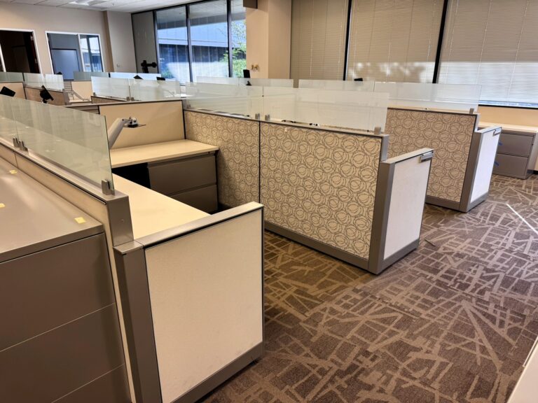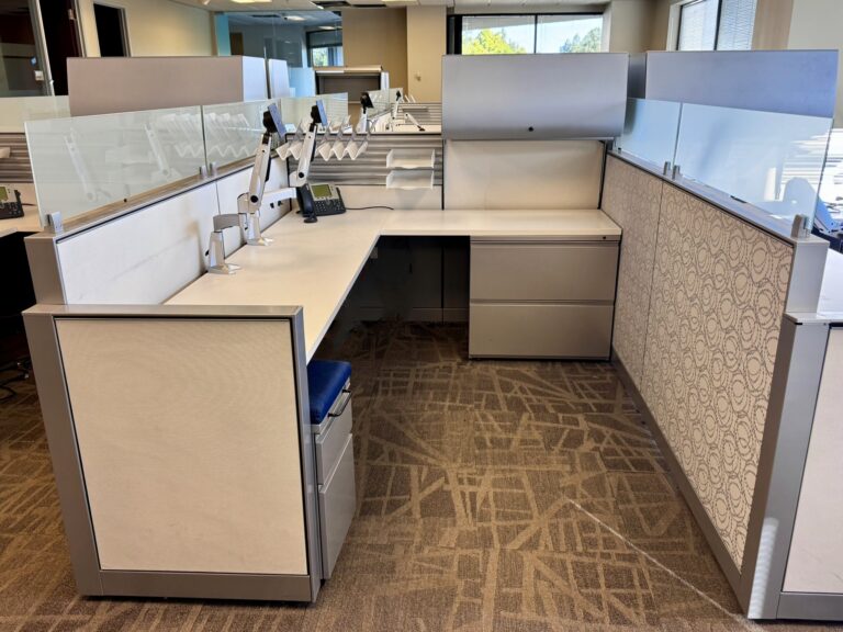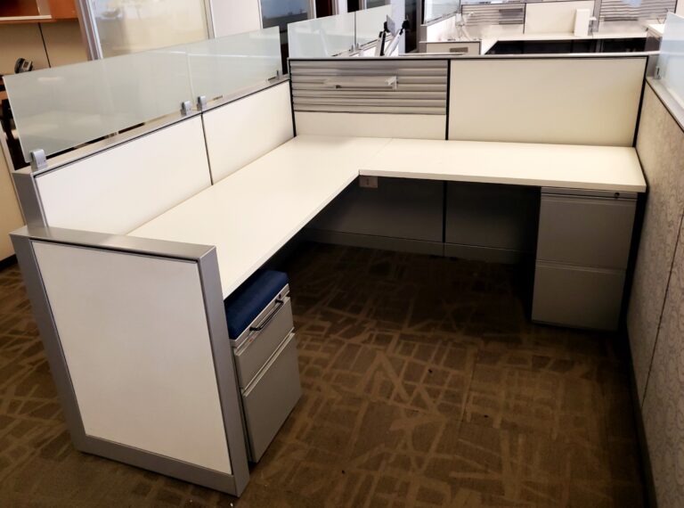 Gorgeous 6’0″ x 6’0″ Herman Miller Canvas Workstations with Glass and Seated Privacy. Set in a beautiful light gray fabric with silver trim and white worksurfaces, these cubicles are certain to improve your work environment. Included is a Box/Mobile Pedestal Drawer Unit with “Optional” Overhead Storage Cabinet.
