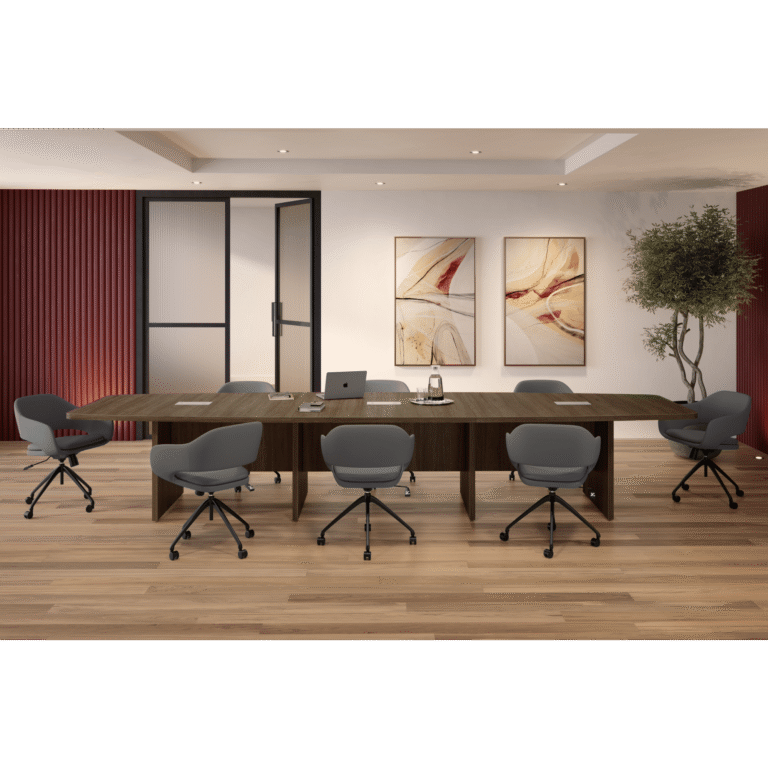 The Pacific Boat Shape Conference Table with Panel Base features tapered ends that improve sightlines and encourage productive conversation in boardroom and commercial meeting spaces. Its robust panel base combines commercial durability with a sophisticated, executive presence. Engineered for lasting commercial performance, this table balances presence, practicality, and professional style. Offered in a range of sizes and finish options to complement your space.